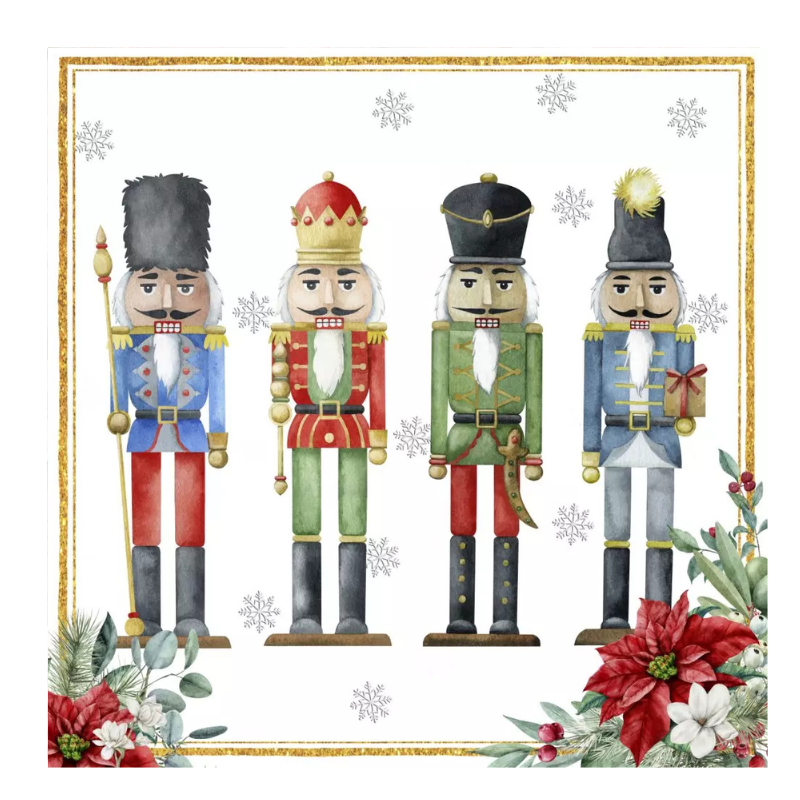Dá um toque clássico e natalício à tua mesa com estes encantadores guardanapos de papel decorados com o icónico Soldadinho Quebra-Nozes. Perfeitos para jantares festivos, ceias de Natal e decorações elegantes!