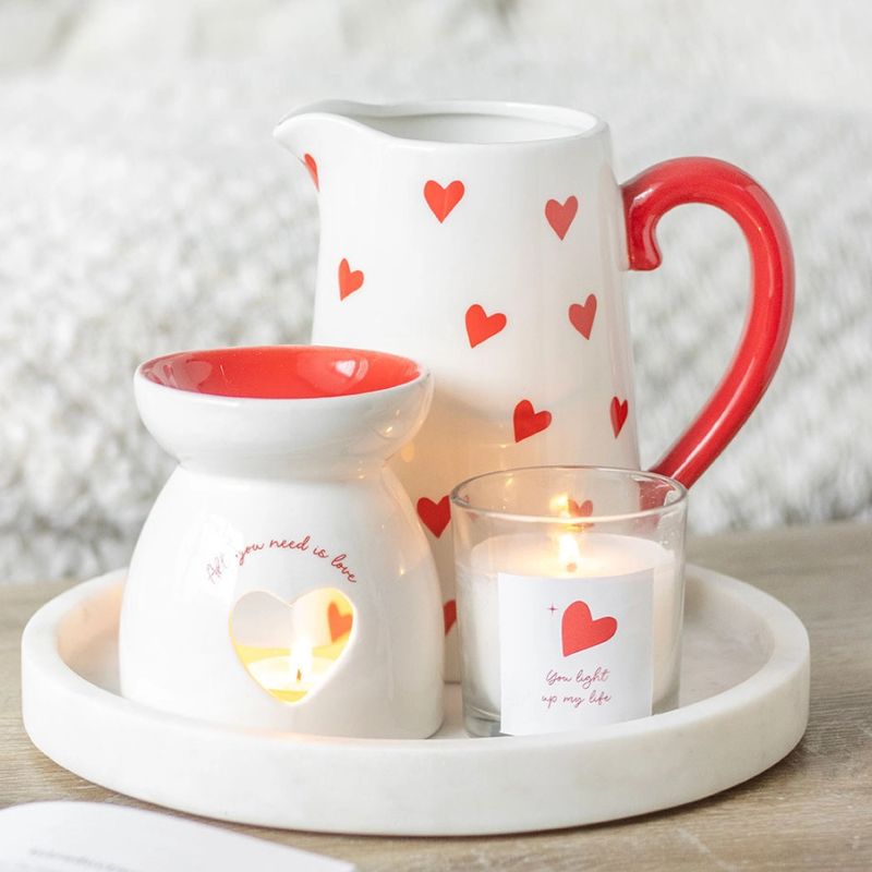 Perfeito para a época do amor, este jarro de flores brancas apresenta uma estampa de coração completa acentuada por uma alça vermelha para segurar as suas flores favoritas do Dia dos Namorados.