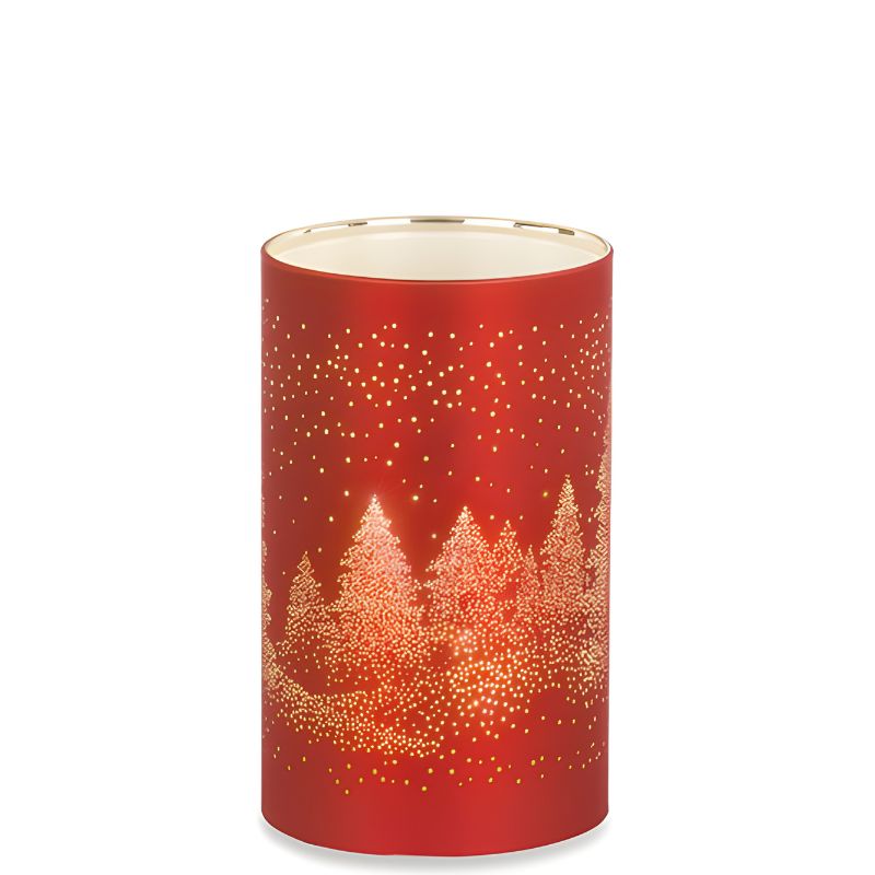 O corpo vermelho apresenta desenho detalhado de árvores iluminadas em dourado, transmitindo sensação de neve cintilante.