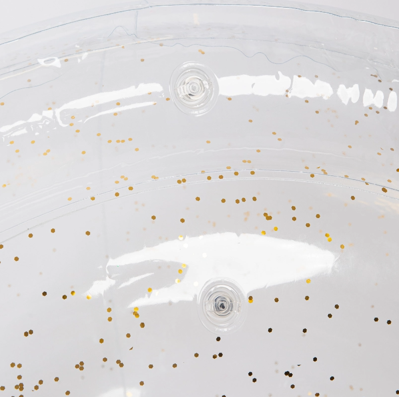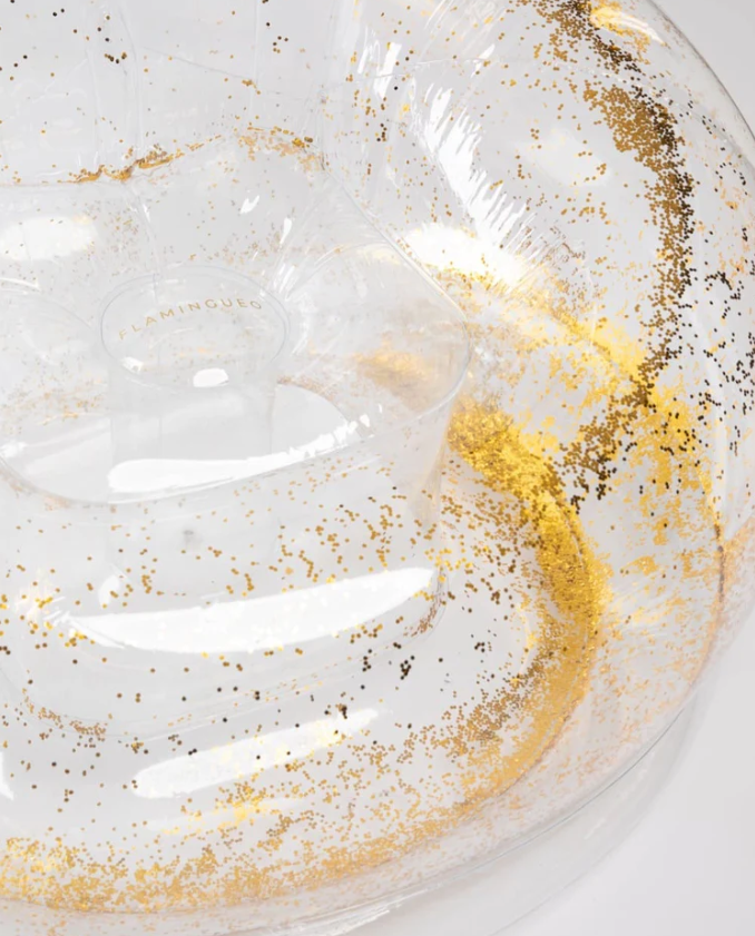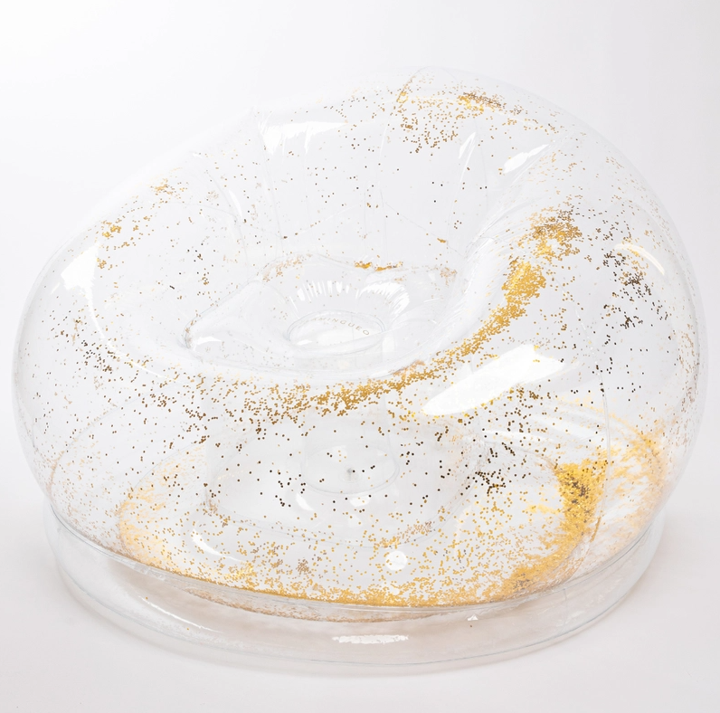 Poltrona inflável com glitter ouro. É um complemento perfeito para decorar o interior ou exterior da sua casa.