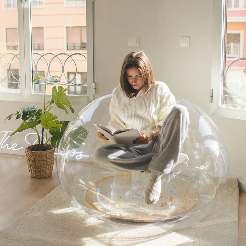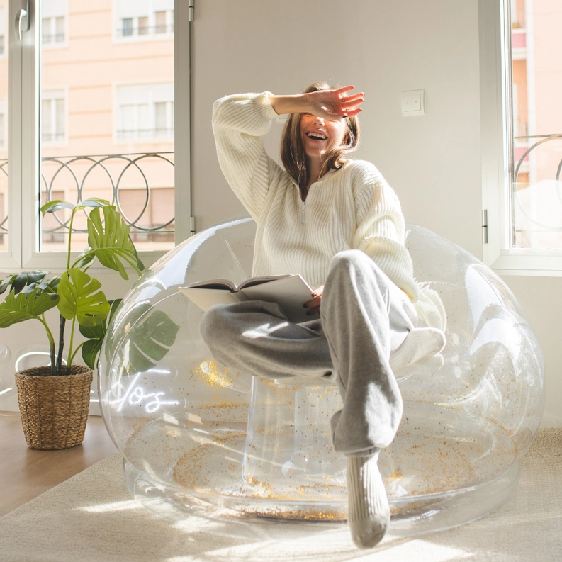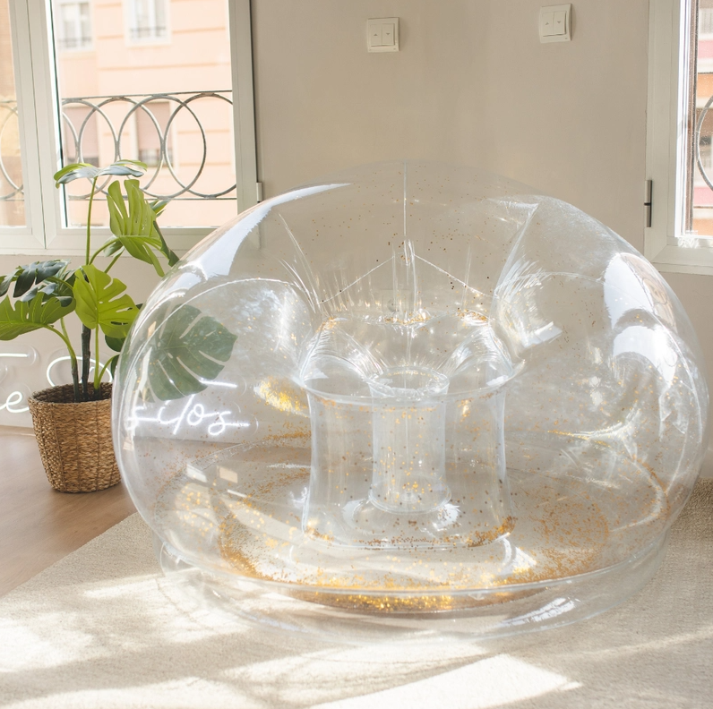 O sofá insuflável é feito de PVC resistente (0,3 mm) de dupla espessura com um acabamento transparente e glitter.