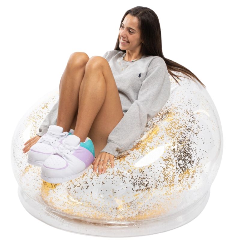 Poltrona inflável com glitter dourado. É um complemento perfeito para decorar o interior ou exterior da sua casa.