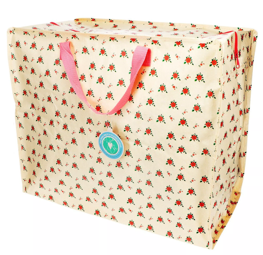 Um saco jumbo amarelo com flores rosas impressas, com mil e uma utilidades!